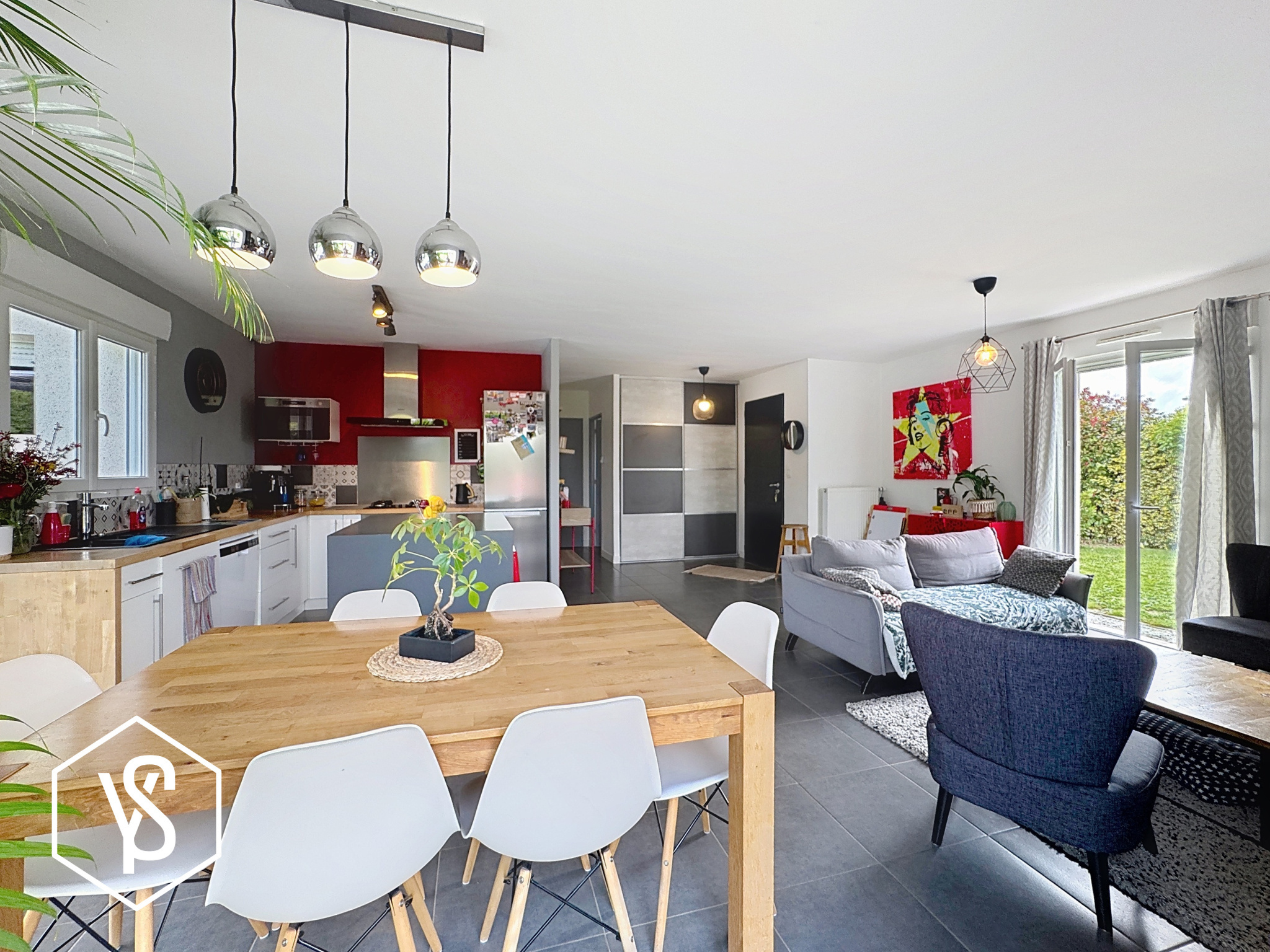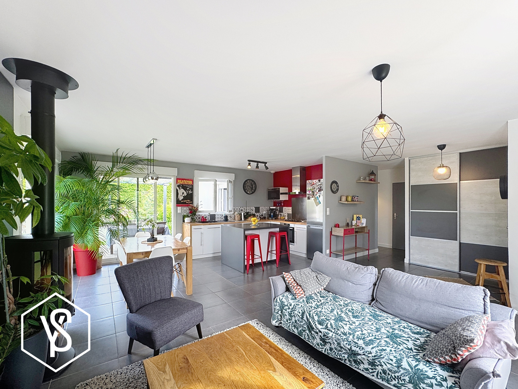 La VILLA "HELIOS" en mode T4/5 de 100m² construite en 2015 se distingue par sa luminosité grâce à une triple exposition particulièrement enviée. L'intérieur se vit de plain-pied avec une pièce de vie généreuse de 50m² avec son poêle bois pièce maitresse. Le coin nuit propose 3 chambres séparées mais aussi un bureau séparé bien appréciable pour le télétravail ou bien salle de jeux pour enfants. Une salle de bains complète (douche et baignoire), une buanderie, toilette séparée et garage.