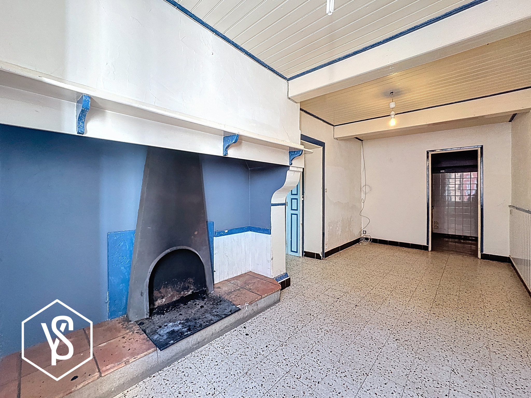 Au rez-de-chaussée : entrée, cuisine/salle à manger avec cheminée, séjour traversant, dégagement et WC séparé.