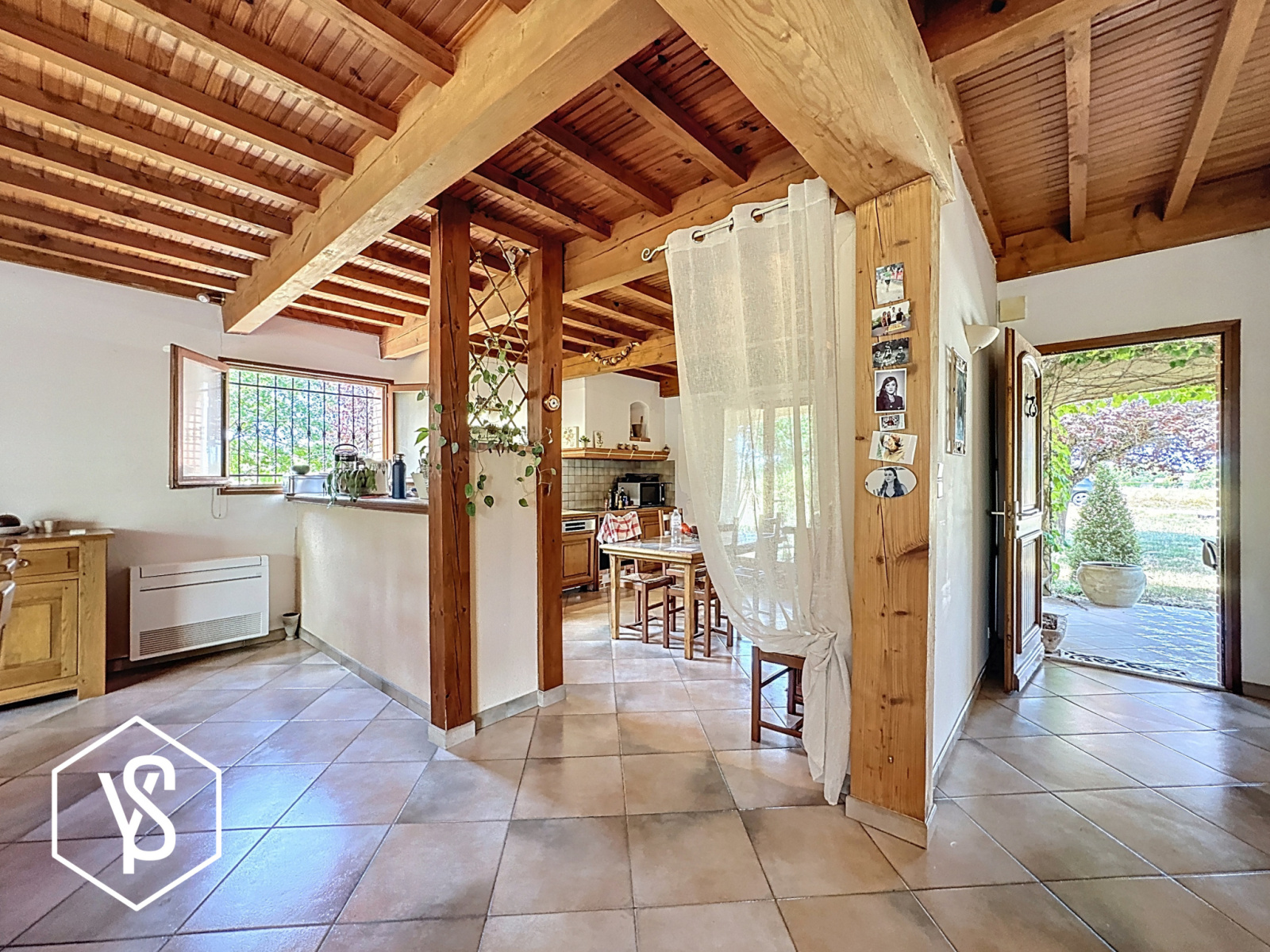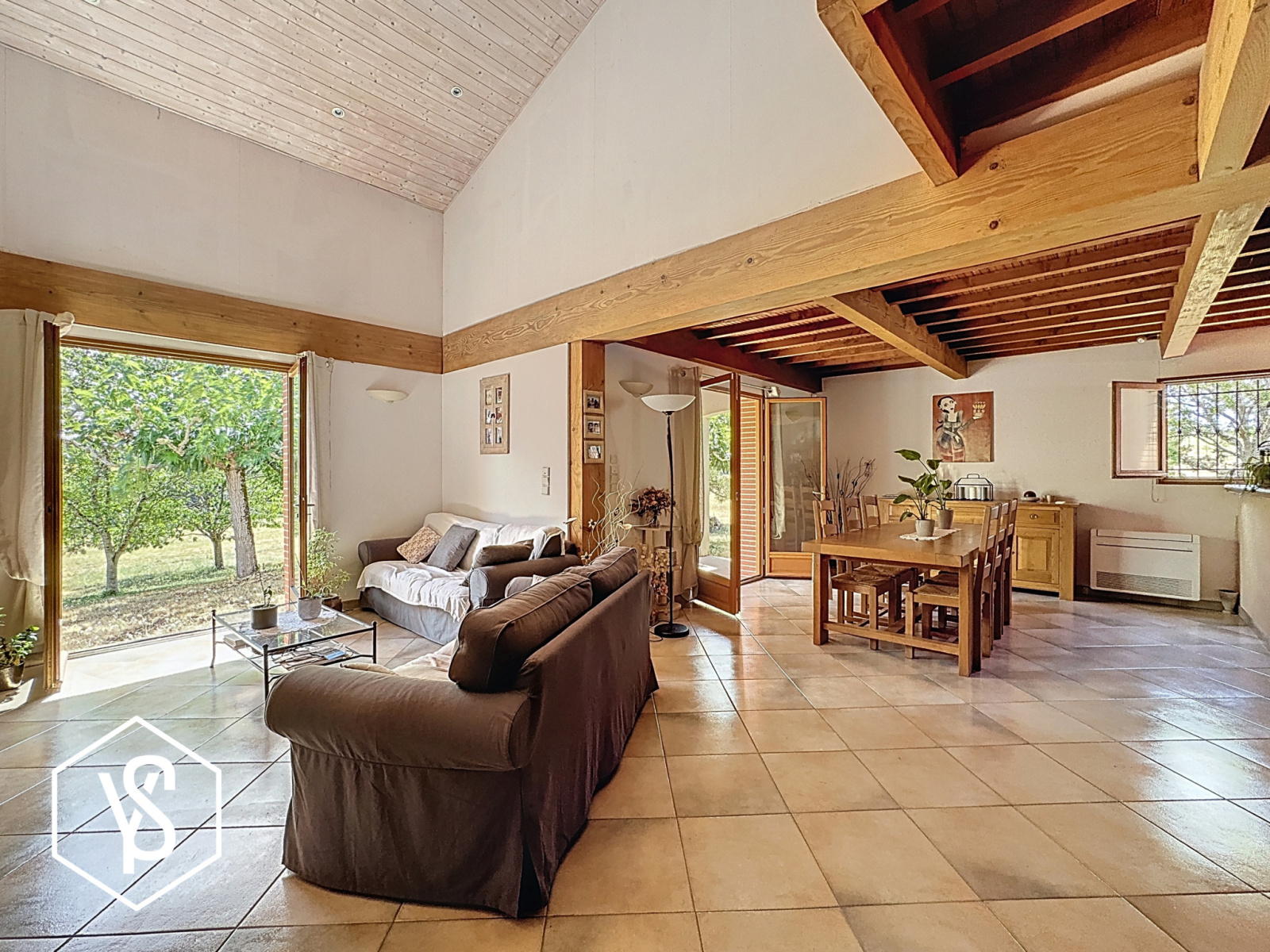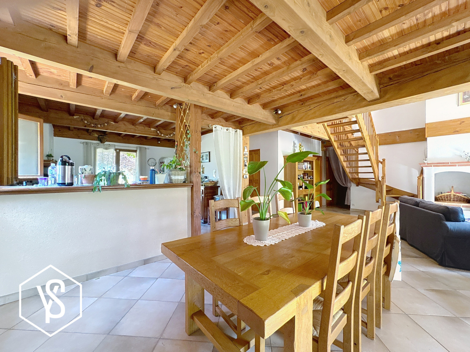 L'entrée dévoile une pièce de vie de 65m² traversante et "déplafonnée" avec charpente apparente et cuisine ouverte. Cet espace "décloisonné" s'ouvre sur les extérieurs et suggère une vie dedans/dehors. Une cheminée avec insert ainsi qu'une climatisation réversible apportent une touche confortable à la pièce.
